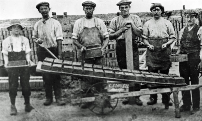 An average of 900 bricks were made each hour. The moulder and off-bearer would change jobs every hour to enable the output rate to be achieved. An average of 44,000 bricks were produced by each hut per week. Wages were dependent on the number of bricks made. It was normal practice for the gangs to hold back payment on say 4,000 bricks in case the weather the following week was bad and they couldn’t achieve their quota. Normal wages per week at this time (in today’s currency) was £2.00 for the moulder, temperer and off-bearer, £1.50 for the flattie, 75p for the barrow pusher and 52.5p for the barrow loader.